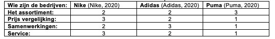 Bij een concurrentenanalyse zijn voornamelijk Nike, Adidas en Puma de bedrijven waar op gefocust wordt. Zoals eerder genoemd zijn de 3 bekendste sportbedrijven Nike, Adidas en Puma. Om een concurrentieanalyse te schrijven wordt er gekeken naar wie de concurrenten zijn, het assortiment dat zij verkopen, de prijs verschillen, met wie zij samenwerkingen hebben en wat voor service er geleverd wordt (Marketingscriptie, 2020). Dit zal hieronder in een tabel weergeven worden. Met 1,2,3 cijfers zal er vergeleken worden met wie er een breder assortiment heeft, goedkopere prijs, bekendste samenwerking en de beste service. 1 staat voor het minste merk en 3 staat voor het beste van de drie sport merken.
